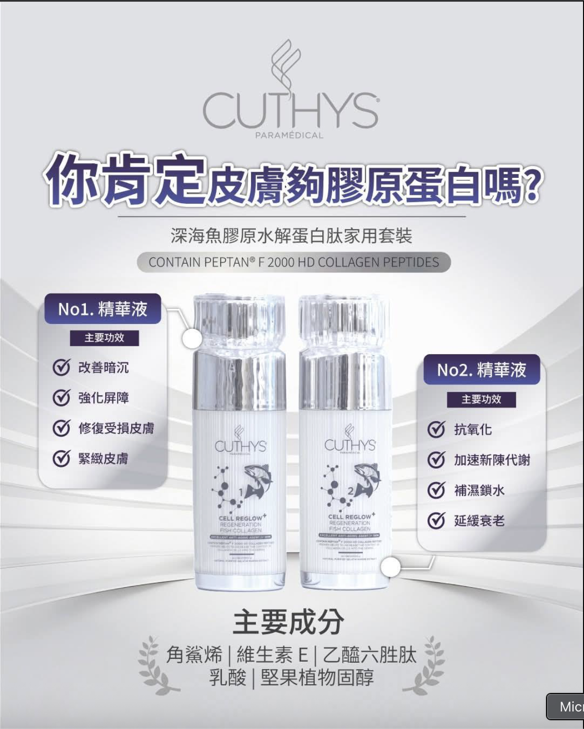 帶大家認識下我地新產品🏆,深海魚🐟膠原水解蛋白1,2號精華, 產品專攻高濃度高滲透👍👍,令每次使用效果都得到最大化,膠原蛋白為皮膚建好地基、卵磷脂強化屏障修復受損肌膚,為我地肌膚加固!今個冬天打造好緊緻彈滑嘅肌膚✨️✨️
